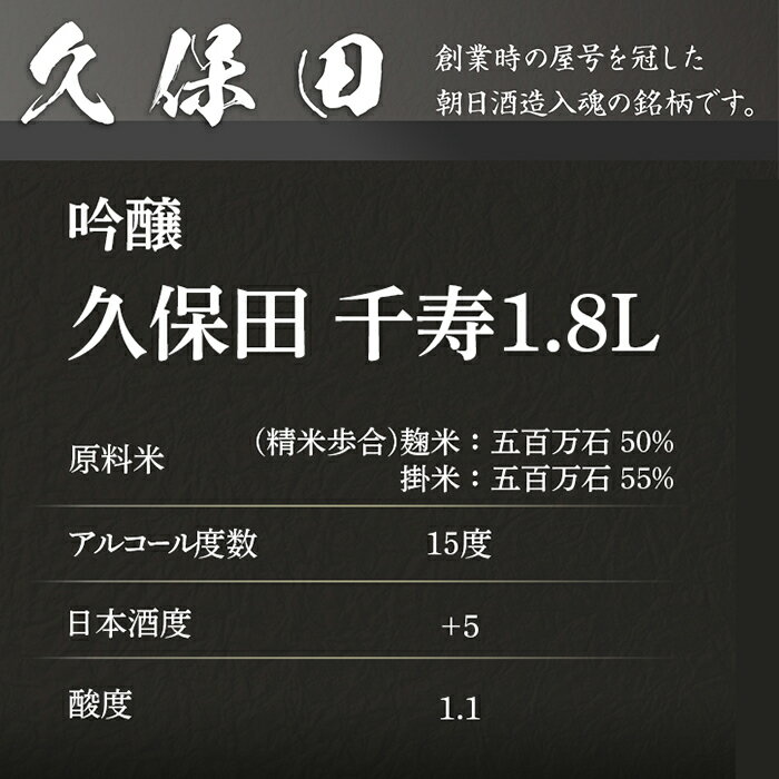 商品詳細 名称 久保田 千寿1.8L(吟醸) 産地名 新潟県長岡市産 内容量 久保田 千寿(吟醸)1.8L 賞味期限 別途商品ラベルに記載 保存方法 冷暗所で保存 発送期日 ご入金確認後、順次発送 詳細 ★